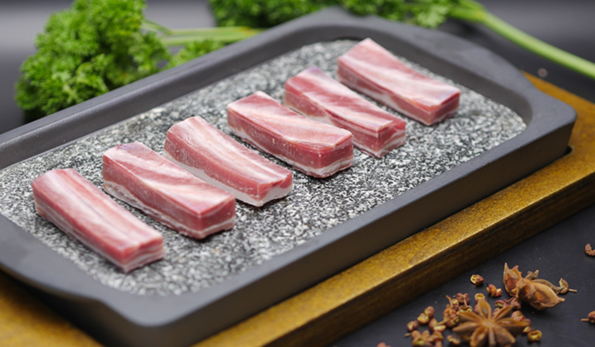 脊椎骨(7-11肋)兩側部位肉,部位肉酮體占3.6%,表面去風干肉、淤血肉及軟硬骨,保留自然脂肪,肉質紅白相間,呈大理石花斑紋狀,肉質細嫩,脂肪含量較高,香甜多汁,不干澀。
